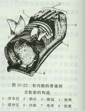 (1)普通斜交輪胎 簾布層和緩沖層各相鄰層簾線交叉與胎中心線呈小于90度角排列的充氣輪胎,稱為普通斜交輪胎。圖20—22所示為有內(nèi)胎的普通斜交胎構(gòu)造。外胎由胎冠3、簾布層l、緩沖層5及胎圈8組成。簾布層是外胎的骨架,用以保持外胎的形狀和尺寸,通常由成雙數(shù)的多層掛膠布(簾布)用橡膠貼合而成。簾布的簾線與輪胎子午斷面的交角(胎冠角)一般為52度~54度,相鄰層簾線相交排列。簾布層數(shù)越多,強度越大,但彈性降低。在外胎表面上注有簾布層數(shù)。