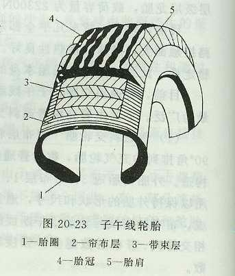 (2)子午線輪胎 圖20—23所示為子午線輪胎的構(gòu)造。它由簾布層2、帶束層3、胎冠4、胎肩5和胎圈l組成,并以帶束層箍緊胎體。其特點是:
