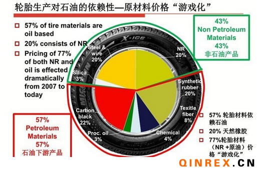 數(shù)據(jù)顯示,輪胎生產中有57%的原材料是來自石油,天然橡膠占原材料總量的20%以上。由此可見,輪胎生產中有超過77%的原材料價格起伏較大。這一特點制約了輪胎企業(yè)的發(fā)展,因此,減少或擺脫對石油的依賴是輪胎業(yè)發(fā)展的必然趨勢。