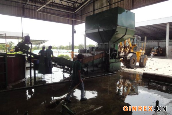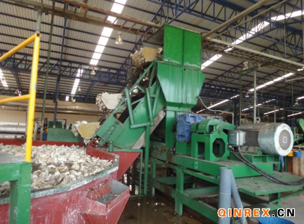杯膠入破碎機(jī)出來的大塊生膠經(jīng)簡單沖洗直接進(jìn)入攪拌池進(jìn)行清洗,木屑及鐵屑等雜質(zhì)被過濾后進(jìn)行二次破碎,破碎成小塊并再次進(jìn)行清洗過濾雜質(zhì),反復(fù)破碎成并進(jìn)入水池清洗。