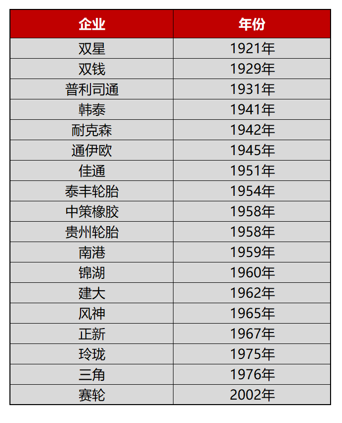 普利司通成立于1931年,只有89年的歷史。中國(guó)最老的輪胎品牌當(dāng)屬雙星,創(chuàng)立于1921年,已經(jīng)擁有99年的歷史,雙錢(qián)緊隨其后擁有91年的歷史。