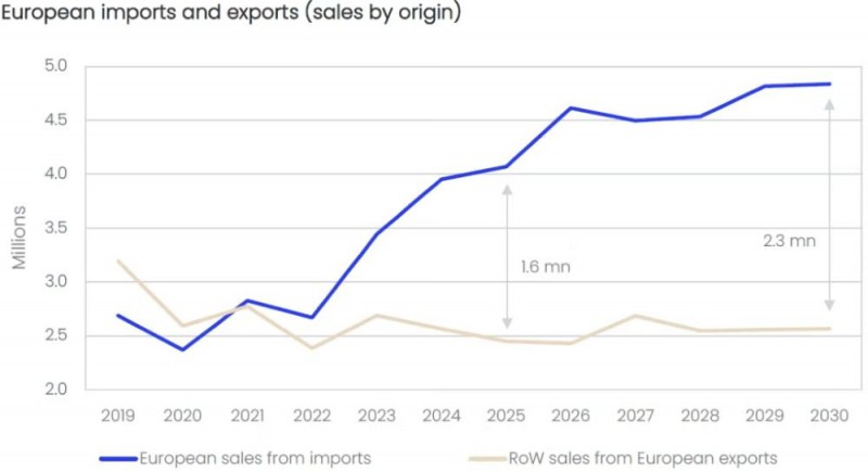 自2021年歐洲成為汽車凈進(jìn)口地區(qū)以來,其進(jìn)出口平衡狀況急劇惡化,2025年汽車貿(mào)易逆差已達(dá)160萬輛。預(yù)計未來幾年這一逆差將進(jìn)一步擴(kuò)大,到2030年將增至230萬輛。由此引出兩個顯而易見的問題:這些進(jìn)口車來自哪里?出口又為何陷入停滯?
